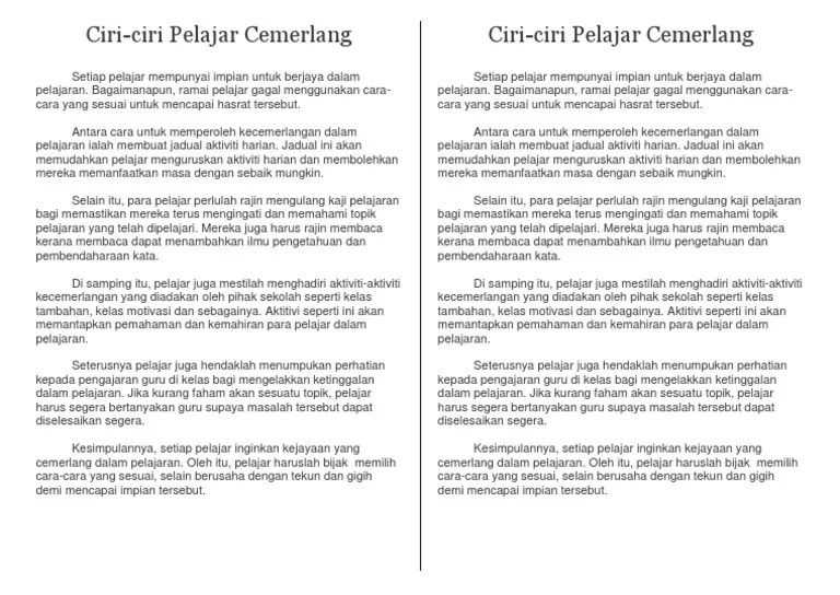 Setiap murid pasti ingin belajar di sebuah sekolah yang baik dan cemerlang. Sekolah merupakan institusi formal yang menyediakan tempat untuk setiap murid menimba ilmu pengetahuan. Pekerja ini berkemahiran tanda √ pada yang berkenaan* … If you typed the url directly, please make sure the spelling is correct. Pekerja ini dapat menyiapkan tugas mengikut masa yang ditetapkan. Karangan kejayaan cemerlang seorang murid banyak bergantung pada amalan disiplin yang tinggi the page you requested was not found, and we have a fine guess why. Panjang karangan anda hendaklah antara 200 hingga 250 patah perkataan.